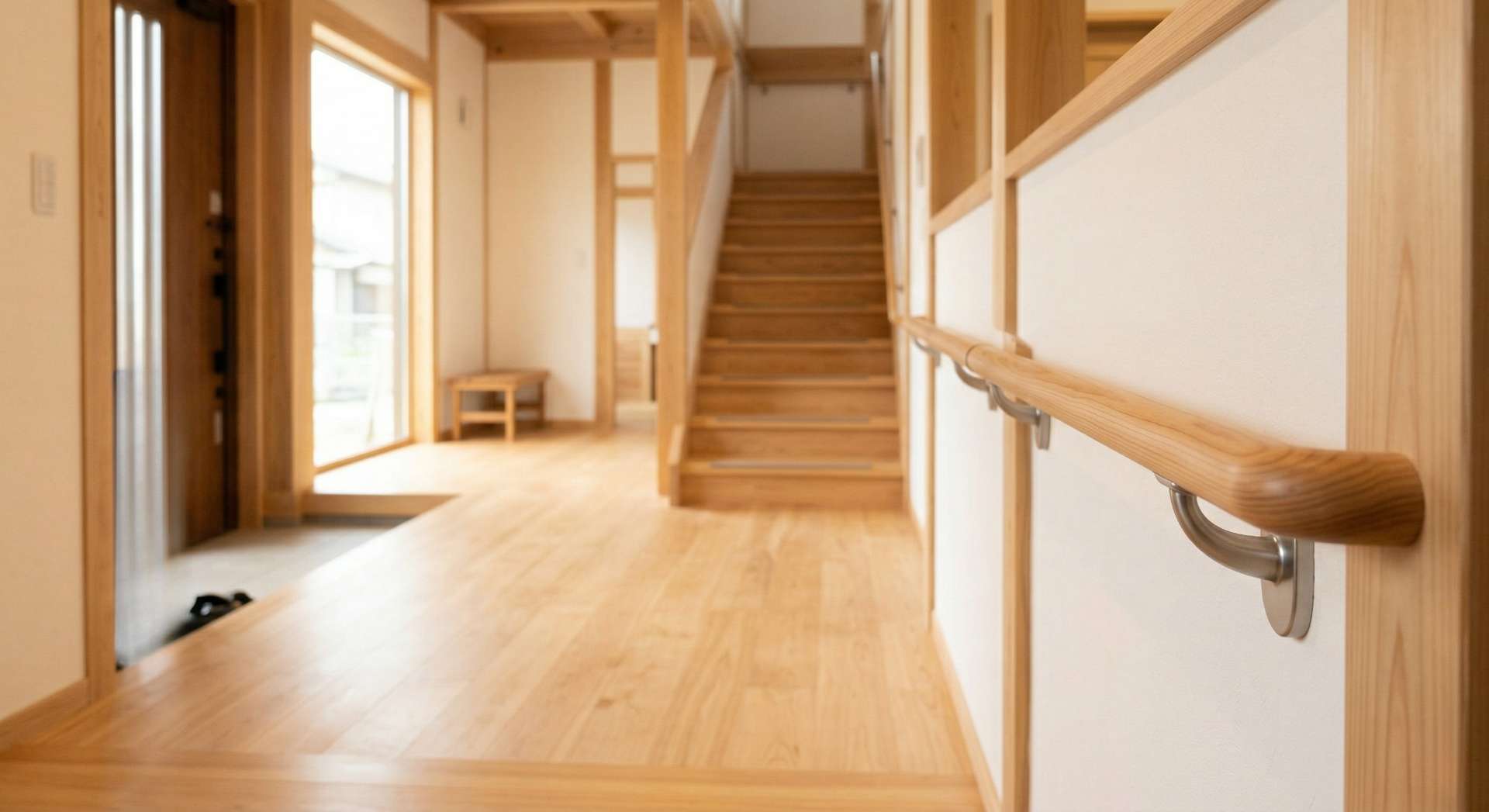 玄関の上がり框(かまち)は大きな段差があるため、体を支える手すりがあるだけで靴の脱ぎ履きがぐっと楽になります。また、廊下がつた歩きできる状態になっていると、部屋から部屋への移動が億劫にならず、活動的な生活を維持しやすくなります。茨城県常陸太田市周辺の古い住宅では廊下が長いケースも多いため、連続した手すり設置が効果を発揮します。