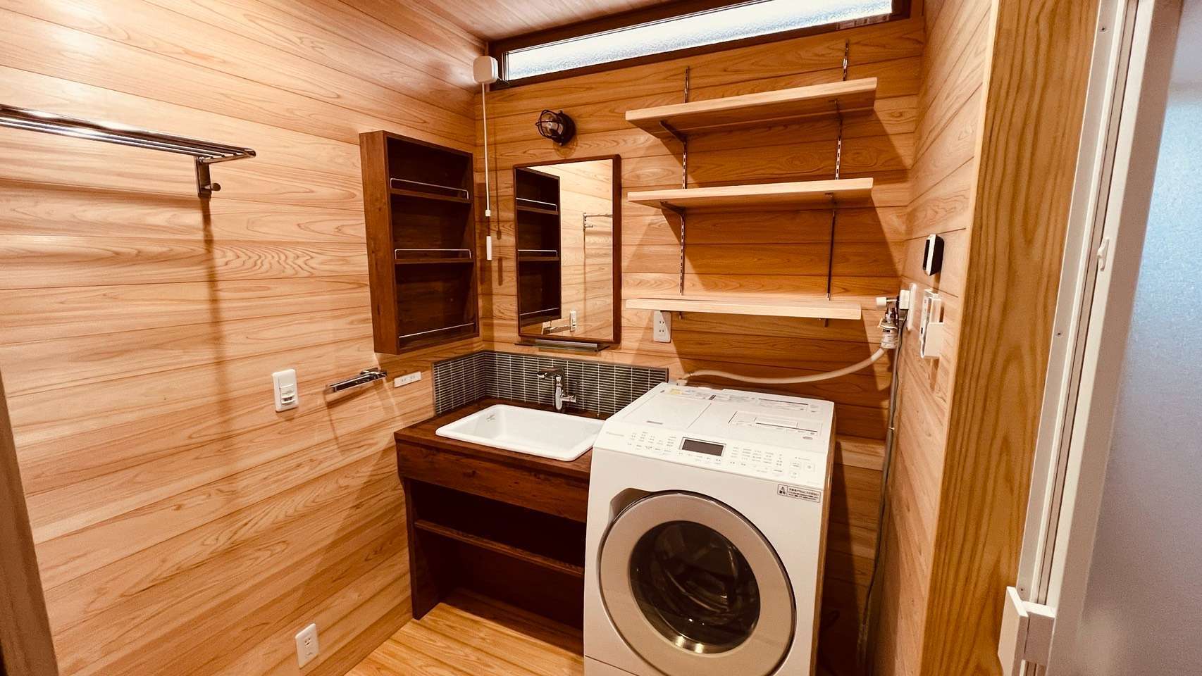 特徴: 壁・天井の全面板張り、フルオーダーの造作洗面台
